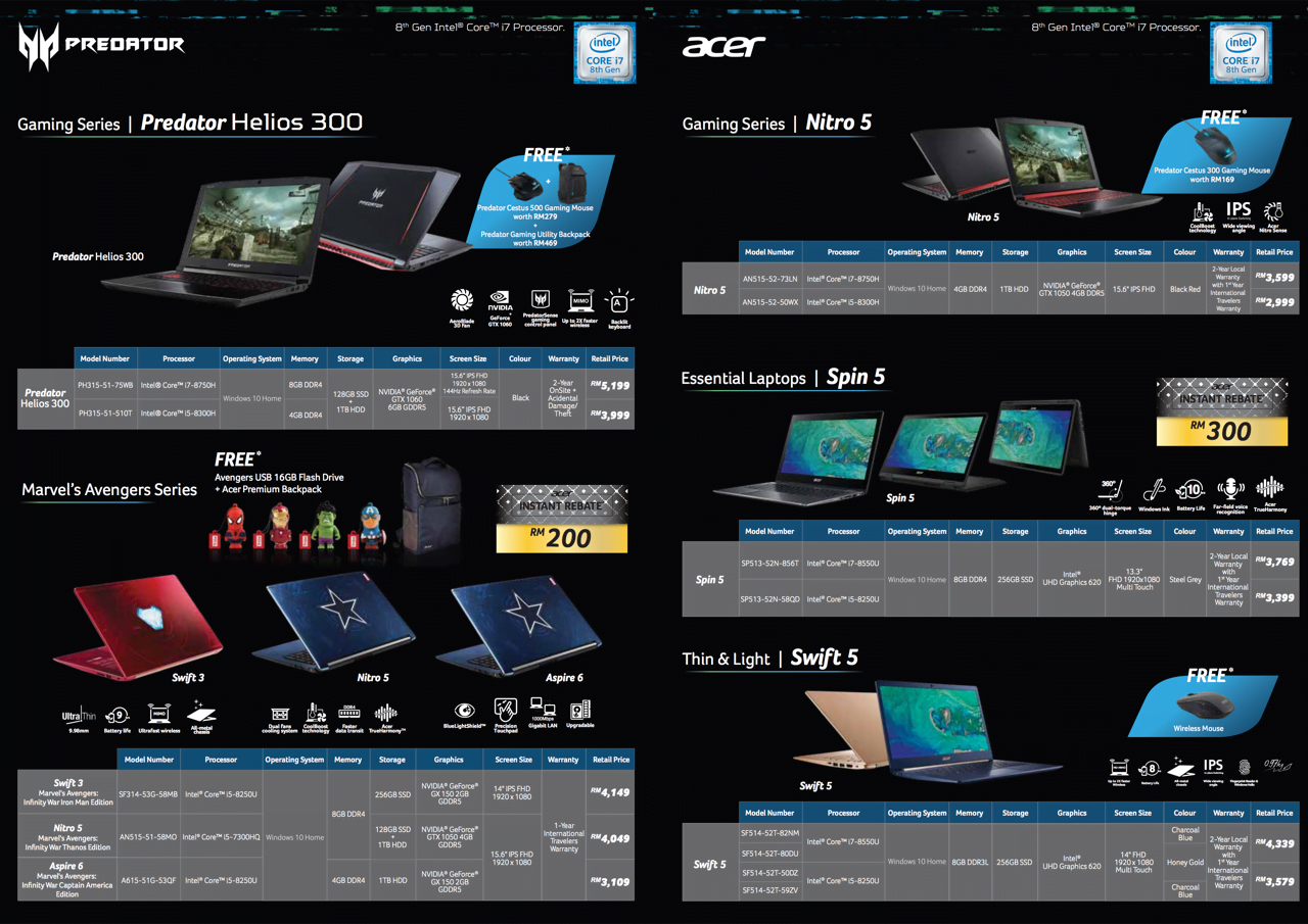 Aside from that, you can also buy other Acer accessories at a discounted price. A few Acer laptops, from the non-gaming line (Spin 5, Swift 3, Swift 5), the ones with Marvel’s Avengers design (Swift 3, Nitro 5, Aspire 6), the affordable gaming laptop Nitro 5, the Predator Helios 300 and the new Helios 500 will all be available for purchase. Buy any products worth RM1,800 and above and you’ll be in for lucky draw for these prizes:
