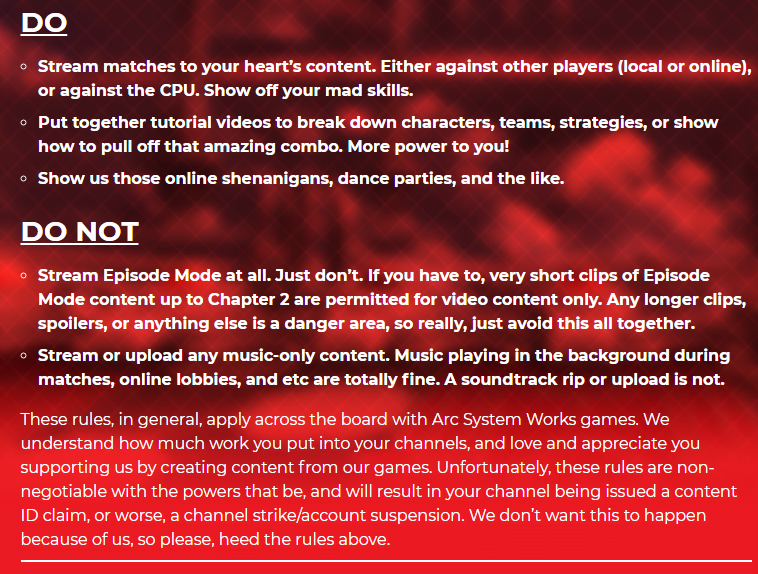 But as the game is now released, developers Arc System Works has issued a streaming guideline for BBTAG. The gist of it is that everything from the Episode Mode- the game’s Story Mode- is off-limits and so are pure soundtrack uploads. Content featuring combo videos, online matchups, streams or videos with the soundtrack playing in the background are A-OK.