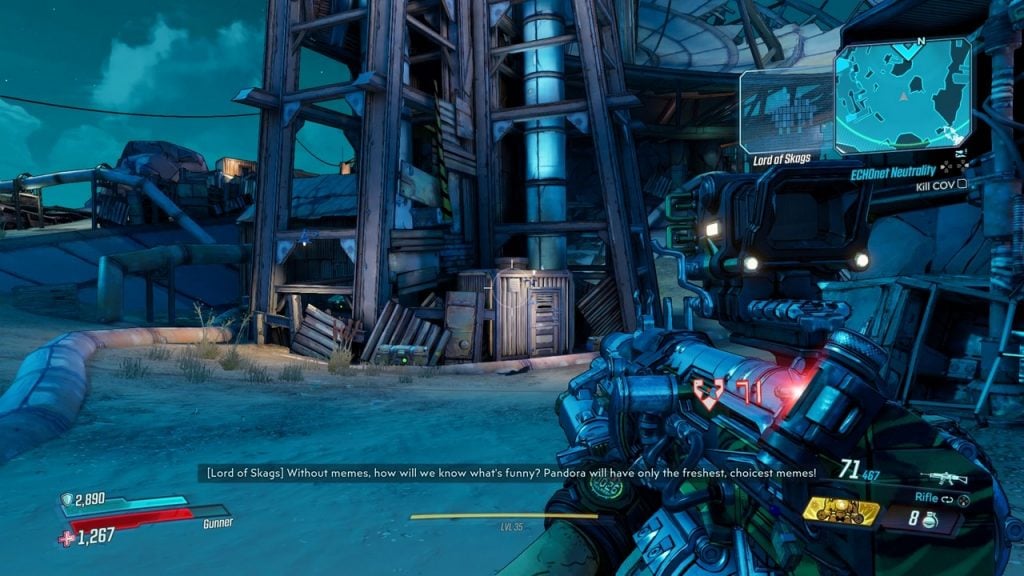 They are a few good ones, including one where resident punching bag Claptrap was not the butt of a joke. Though you must really love low-brow humour to be laughing out loud throughout the game.