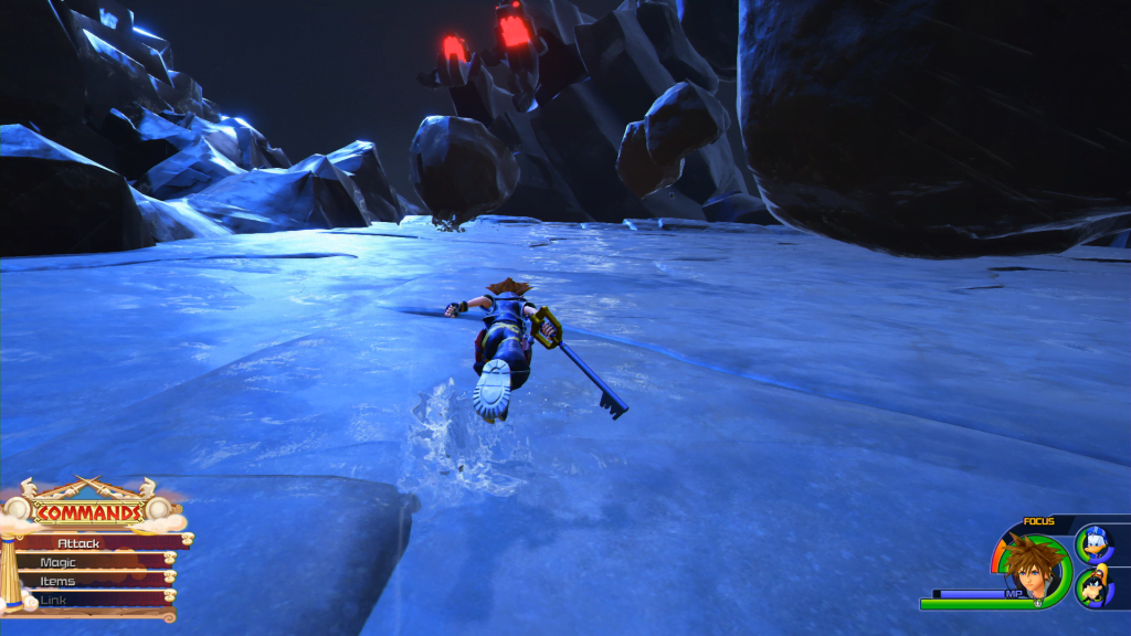 First thing that did not sit well for me is the auto-run. Sora can now walk on specific walls indicated by a shimmer of light glowing from the top down. It’s cool, until you try turning. Sora can only auto-run either straight up or left/right. Boulders are dropped along the wall to impede you. Abruptly turning 90 degrees left/right from running upwards feels… off.