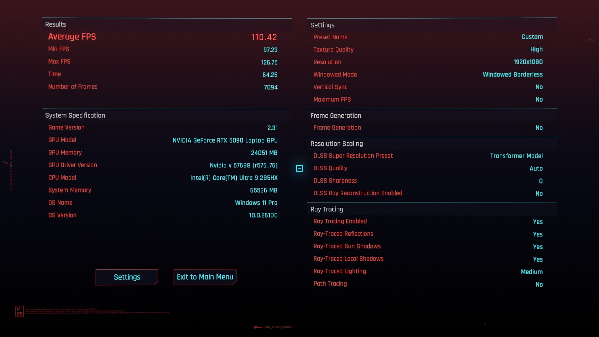 The MSI Titan 18 HX AI (12XWJG) is quite a powerhouse, as I mentioned above, so performance isn’t really an issue with this gaming laptop. So when putting it into the Cyberpunk benchmark, you can see the FPS numbers going really high, even with Ray-Tracing on, with an average of 110fps measured.