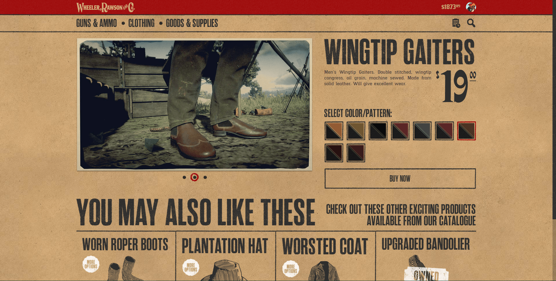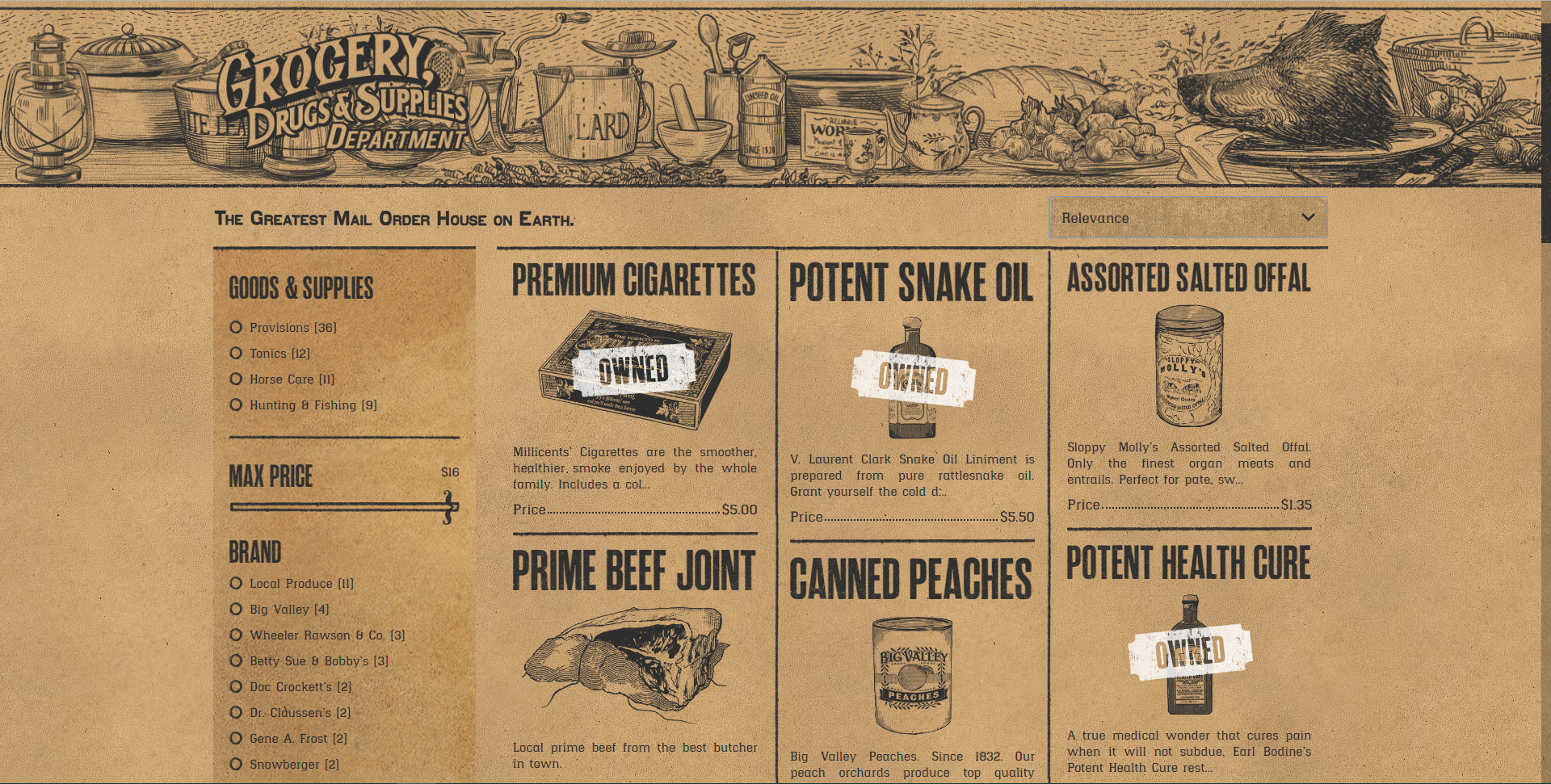 The other is the odd convenience we mentioned. It allows you to stock up on items so you’re ready to go on your adventures. It gives you access to the full catalogue from Wheeler & Rawson, the ones you see and open in shops in the game.