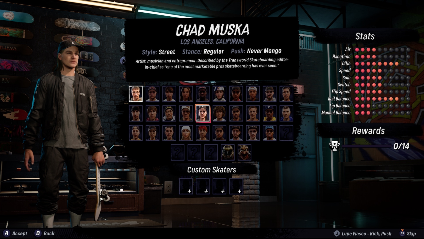 Skating also feels weird at the start, since it feels like your character sticks too much to the board (something THPS5 did, but even worse), but that it will get looser as you add more stats into your skater of choice, since the Stats do matter more now than in their previous remake.