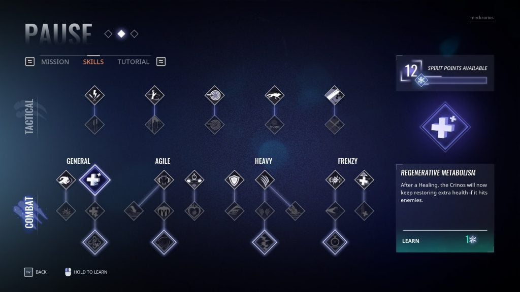 - Combat: General – Regenerative Metabolism (1 Skill Point) – Crinos can gain more health by hitting enemies after using Healing.